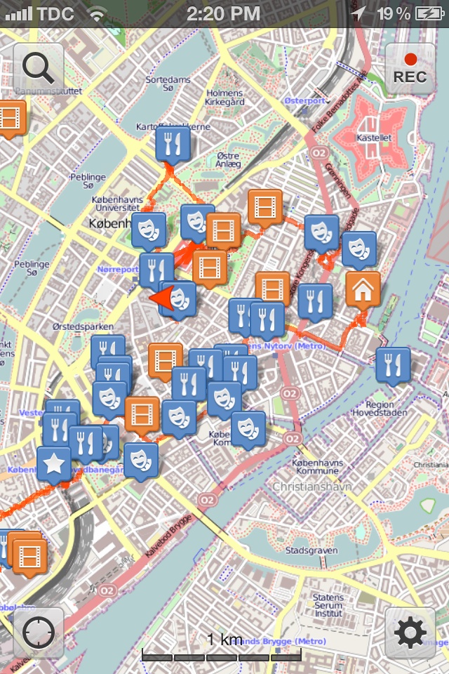 | Same Copenhagen map, but with today’s walking route (red line) marked. |