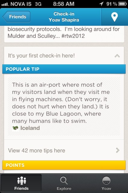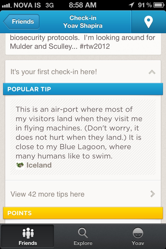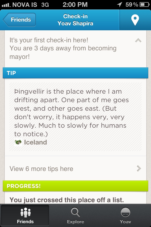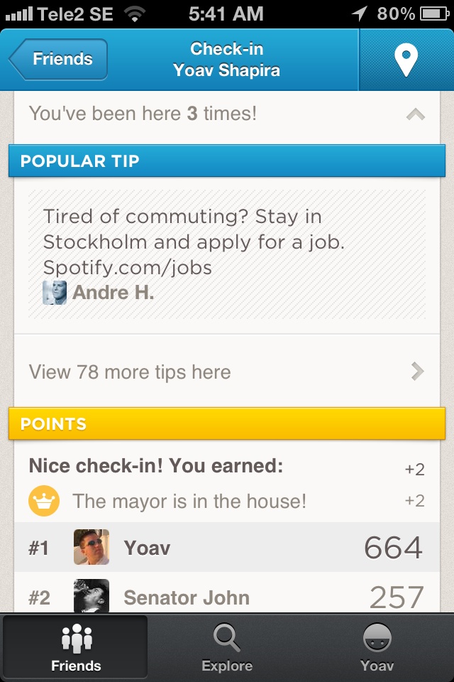 It was nice to see some governments (e.g. Iceland, see below screenshots) and companies (e.g. Spotify, also below) using Foursquare to help their causes (tourism and recruiting, respectively). Both used fun, fresh voices with personality — kudos to them.