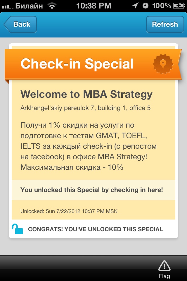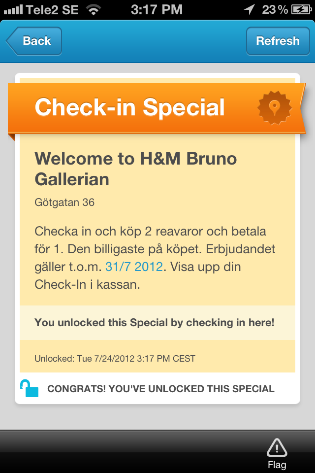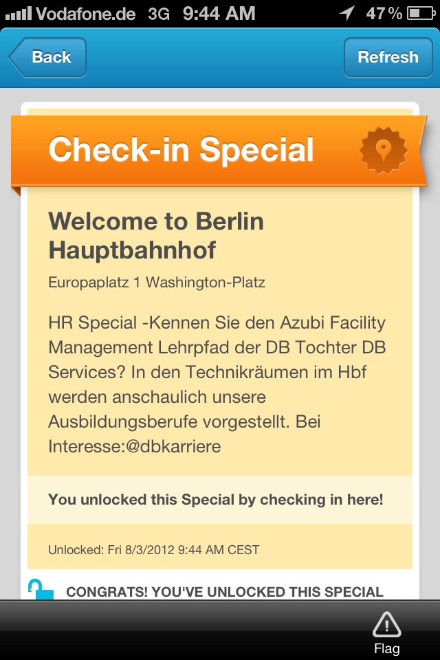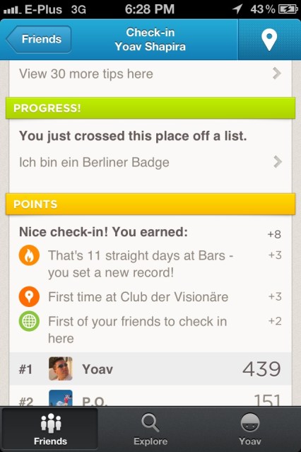 It was also interesting to see the internationalization (i18n) and localization (l10n) efforts Foursquare has put in since 2010, clearly visible when unlocking checkins, as you can see in a couple of examples below.