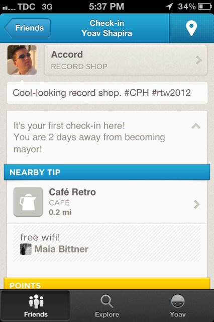 I had a couple of “small world” moments, where I checked into a venue in a remote city / country I’d never been, only to find a friend had been there and left a valuable tip. This was especially fun when it happened in off-the-beaten-path, not mainstream, venues, like this record shop in Copenhagen. I texted my friend Maia (who put out this tip), and she enjoyed it as well, on Twitter.