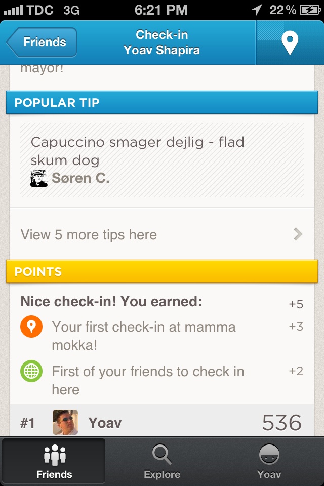 The Foursquare leaderboard is still an obvious gaming element with little value or purpose. It’s too heavily stacked towards new places, and doesn’t reward repeat visitors enough. I not only led it during most of my trip, but I routinely had 4x-6x as many “points” as the nearest person, which is not cool, demoralizing, and destroys the gaming dynamic. I’m not sure why they keep this feature.