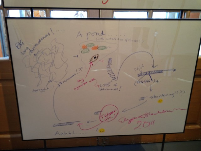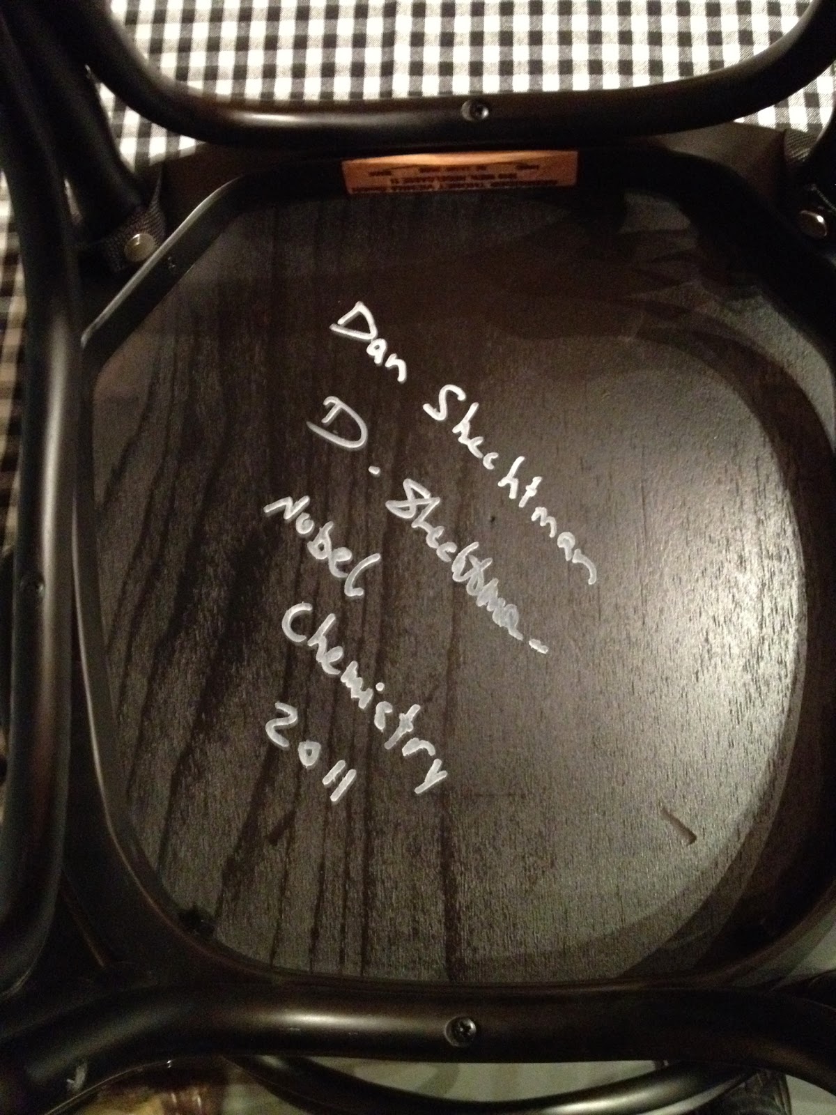 There’s a small cafe where I had a snack. Every chair is autographed by a previous prize winner, as I realized while reading about the cafe and having my snack. I flipped my chair around, only to find it was signed by an Israeli winner, Professor Dan Shechtman! Small world…