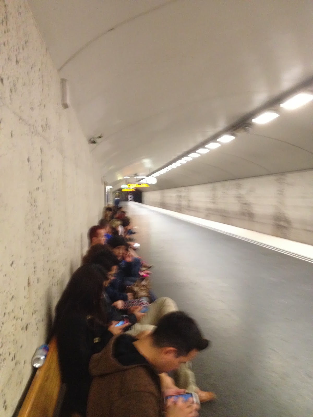 | Waiting for the first subway train of the morning in a clean, organized, mobile fashion. |