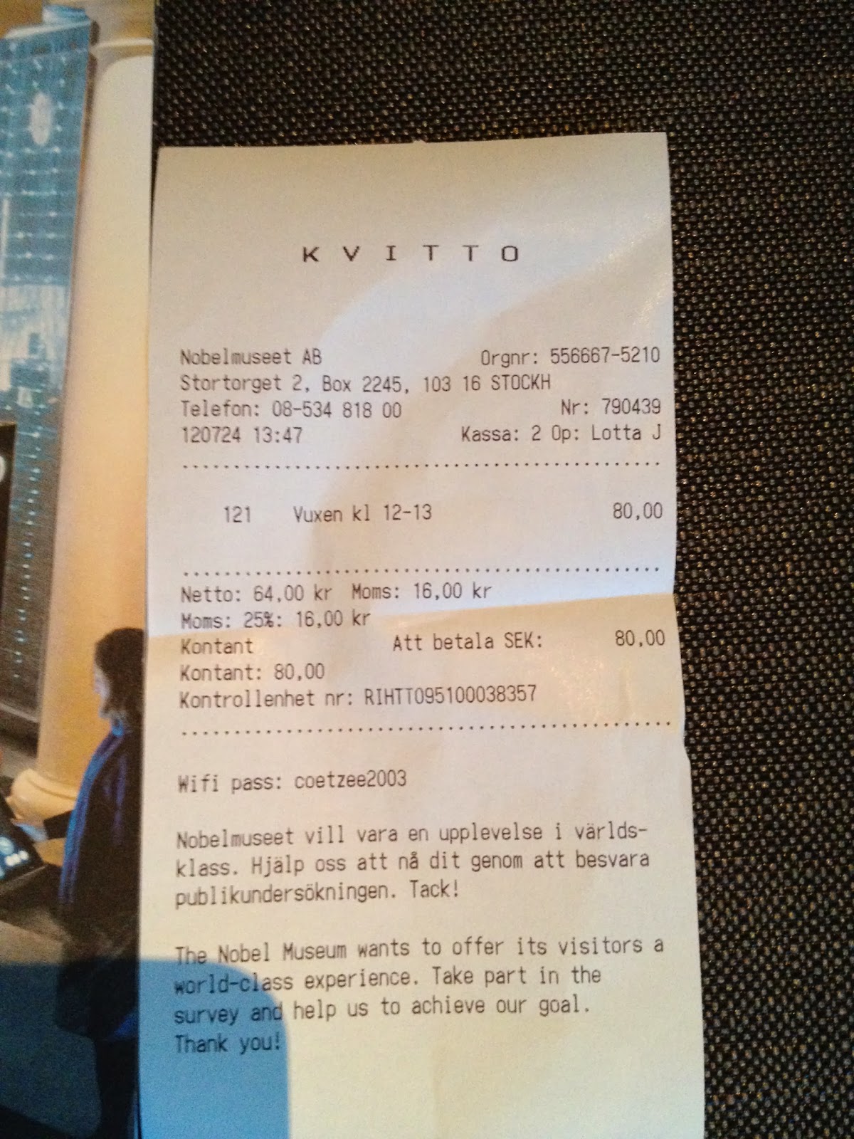 I really enjoyed the Nobel museum. It’s not big, but it’s dense and rich with fascinating displays. Besides the picture and bio of every winner, they have a lot of research materials, such as original lab notebooks and pictures and such, all annotated with handwriting from the researchers. Really cool.